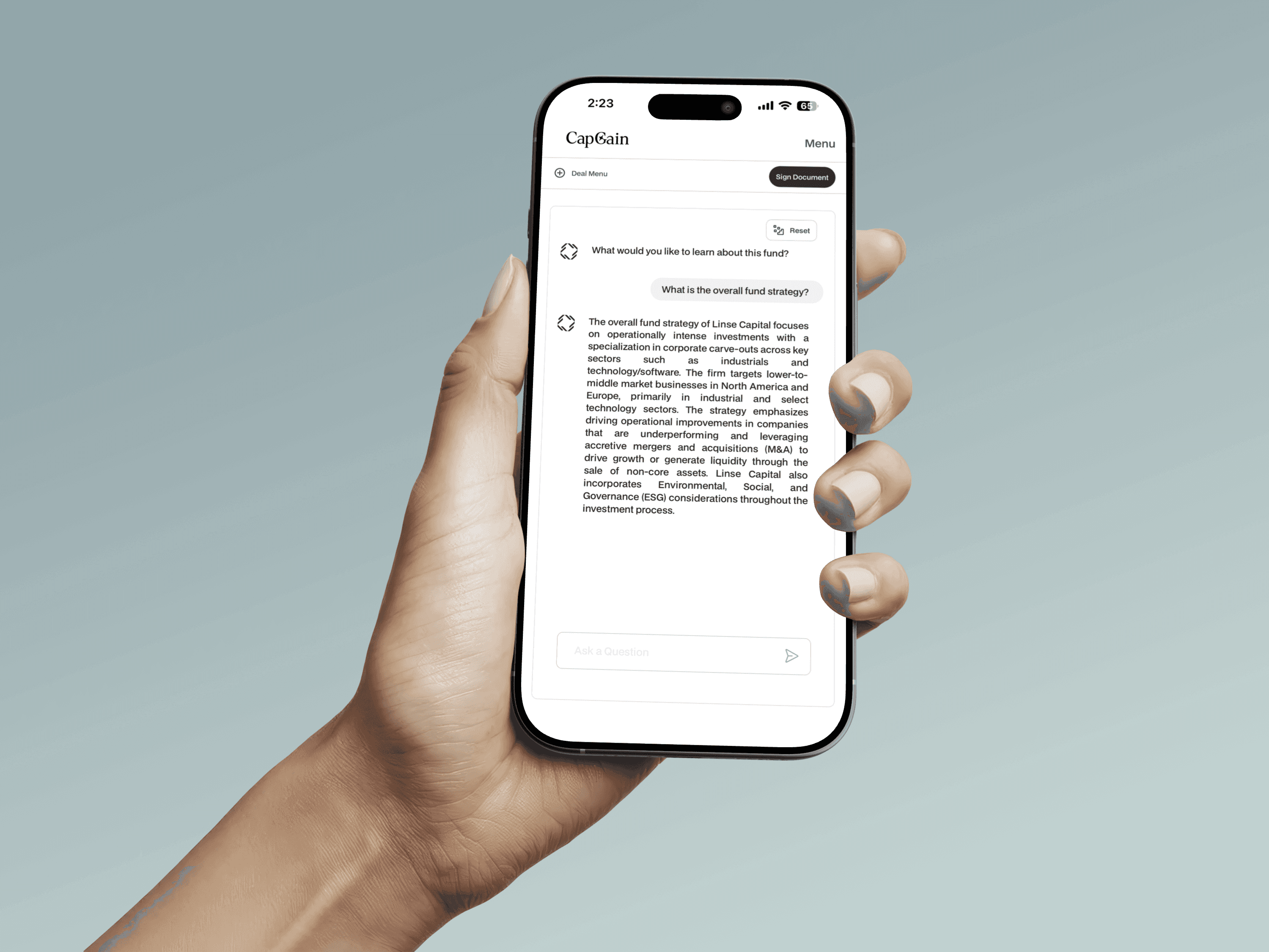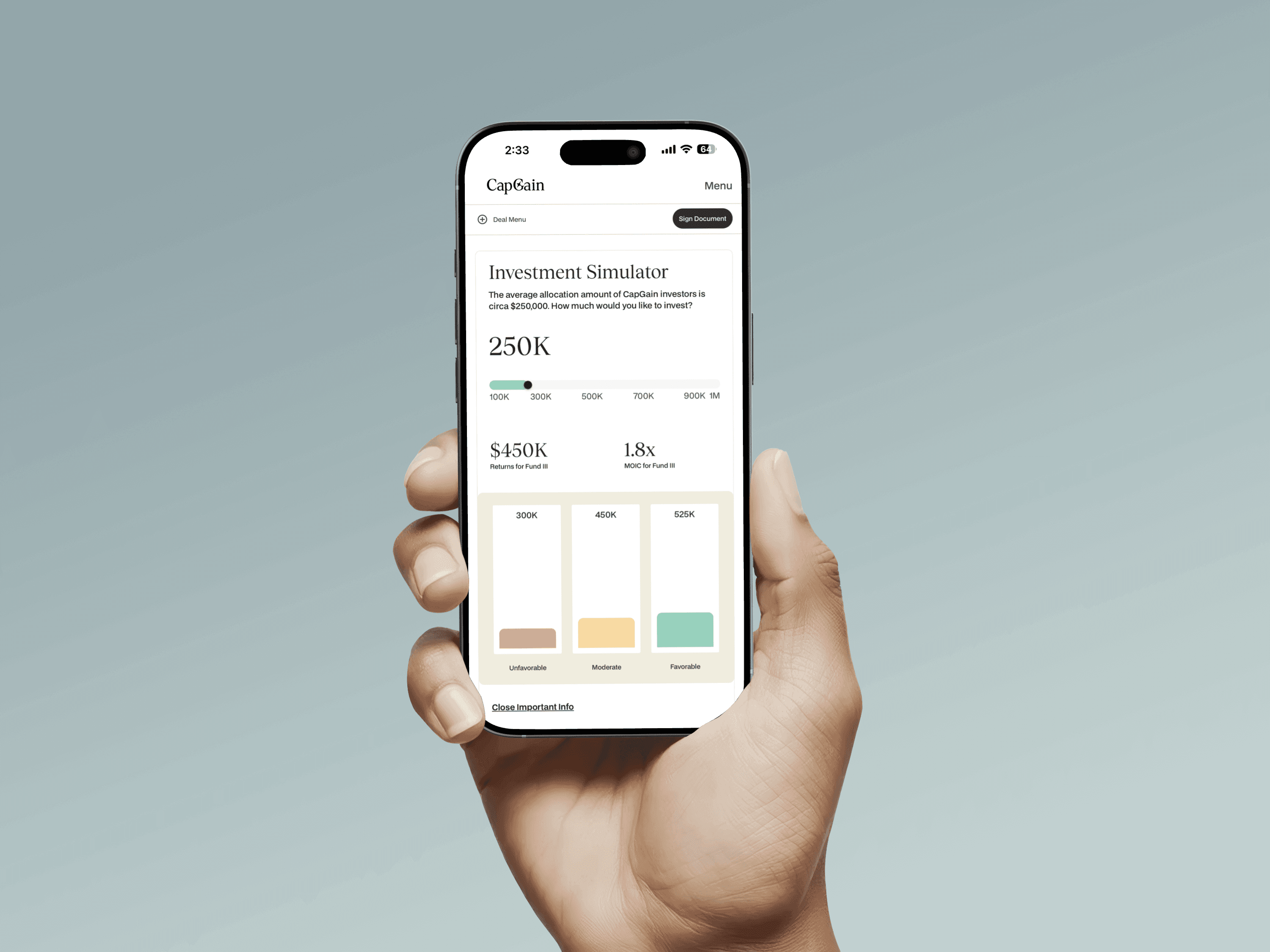 CapGain does not make investment recommendations and no communication, through this website or otherwise should be construed as a recommendation of any security. Alternative investments in private placements are highly illiquid, speculative, and involve a high degree of risk. Past performance is not indicative of future results. Investors may not get back their money originally invested and those who cannot afford to lose their entire investment should not invest. Prior to investing, carefully consider the respective fund documentation for details about potential risks, charges, and expenses. The value of an investment may go down as well as up. An investment in a private equity ("PE") fund or investment vehicle is not the same as a deposit with a banking institution. Investors receive illiquid and/or restricted membership interests that may be subject to holding period requirements and/or liquidity concerns. Investors who cannot hold an investment for the long term (at least 10 years) should not invest. In the most sensible investment strategy for PE investing, PE should only be part of your overall investment portfolio. The PE portion of your portfolio may include a balanced portfolio of different PE funds.