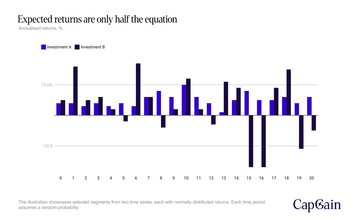 However, the advantage is immediately wiped out by a few periods of negative returns that lead to significant losses for Investment B. As a result, the value of Investment A - characterised by steady returns - surpasses Investment B.
